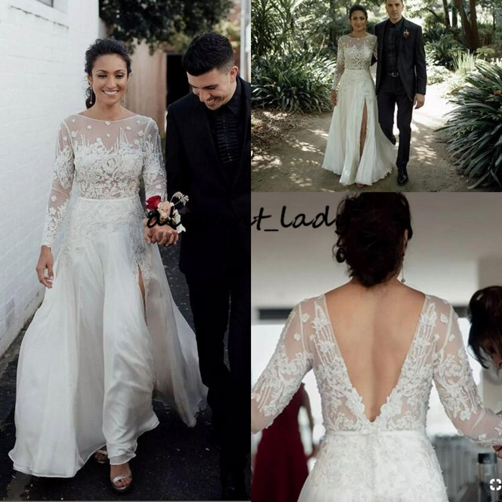 Playa Vestidos Para Boda Nupcial Baile Vestidos Mangas Largas De Encaje Nuevo Informal De Tren De Barrido Ebay