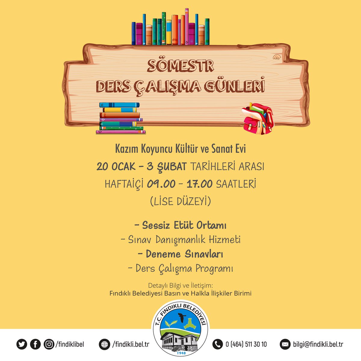 Uzivatel Findikli Belediyesi Na Twitteru Somestr Ders Calisma Gunleri 20 Ocak 3 Subat 09 00 17 00 Kazim Koyuncu Kultur Ve Sanat Evi Tum Ogrencilerimiz Davetlidir Https T Co 8df8llefpu
