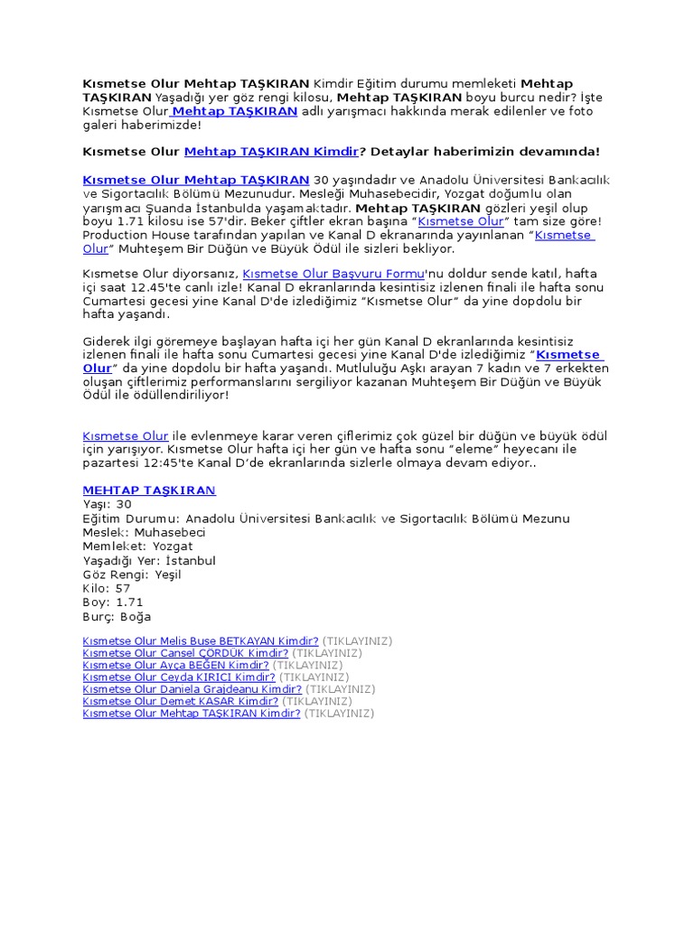 30 mayıs 2016 02 45 yorumcu kimliği. Anadolu üniversitesi bankacılık ve sigortacılık bölümü mehtap taşkıran meslek. Adı soyadı mehtap taşkıran yaşı 31 20 04 1985. Hatta tv programlarının özellikle evlilik programlarının müdavimi iseniz onu mutlaka hatırlayacaksınız kısmetse olur hafta içinde her gün daha önceki yıllarda benzerlerini izlediğimiz çeşitli ilginç yarışma programlarından biridir.